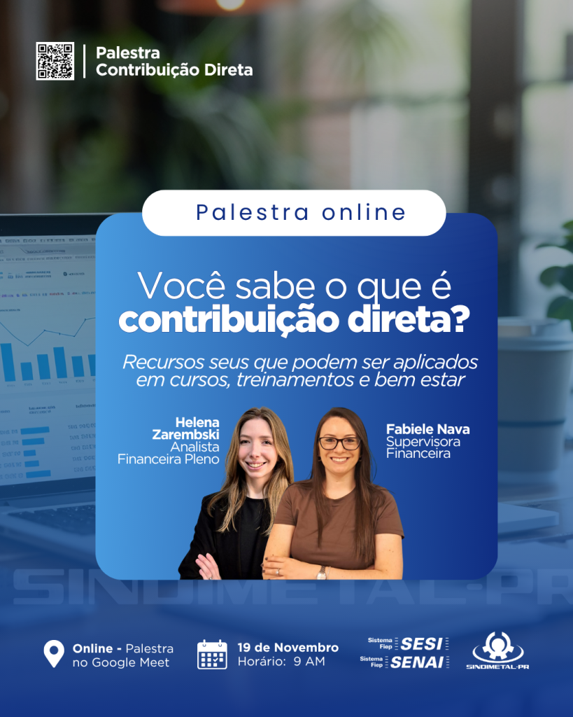 O SINDIMETAL-PR convida seus associados e filiados a participarem de um encontro online exclusivo sobre a Contribuição Direta ao SESI e SENAI, uma modalidade que permite direcionar recursos para ações que realmente fazem a diferença no desenvolvimento da sua empresa e de seus colaboradores.