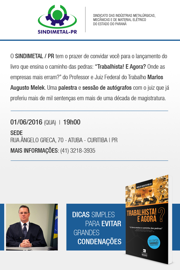 O SINDIMETAL/PR convida para a palestra e lançamento do livro, conforme convite abaixo