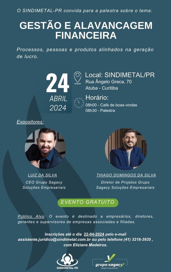 Participe da palestra “Gestão e Alavancagem Financeira: processos, pessoas e produtos alinhados na geração de lucro”. O objetivo do SINDIMETAL/PR, juntamente com o Grupo Sagacy Soluções Empresariais, é proporcionar novas percepções estratégicas e destacar práticas eficazes para potencializar os resultados financeiros de sua empresa.