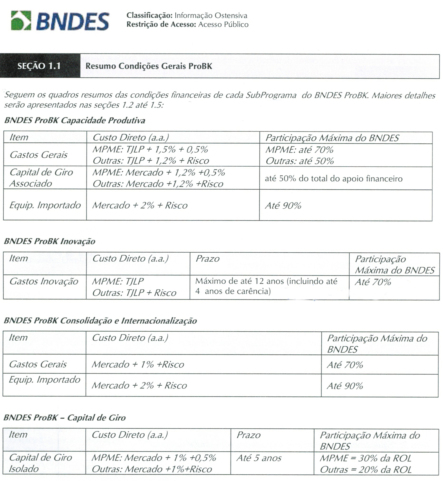 O principal objetivo do ProBK é incentivar a indústria de bens de capital e sua cadeia de fornecedores, por meio do apoio aos investimentos em aumento da capacidade produtiva, modernização de instalações e inovações no setor. O BNDES vislumbra a possibilidade da redução no limite mínimo para empréstimos diretos, atraindo empresas de menor porte, inclusive aquelas que tenham receita operacional bruta anual menor ou igual a R$ 2,4 milhões.
