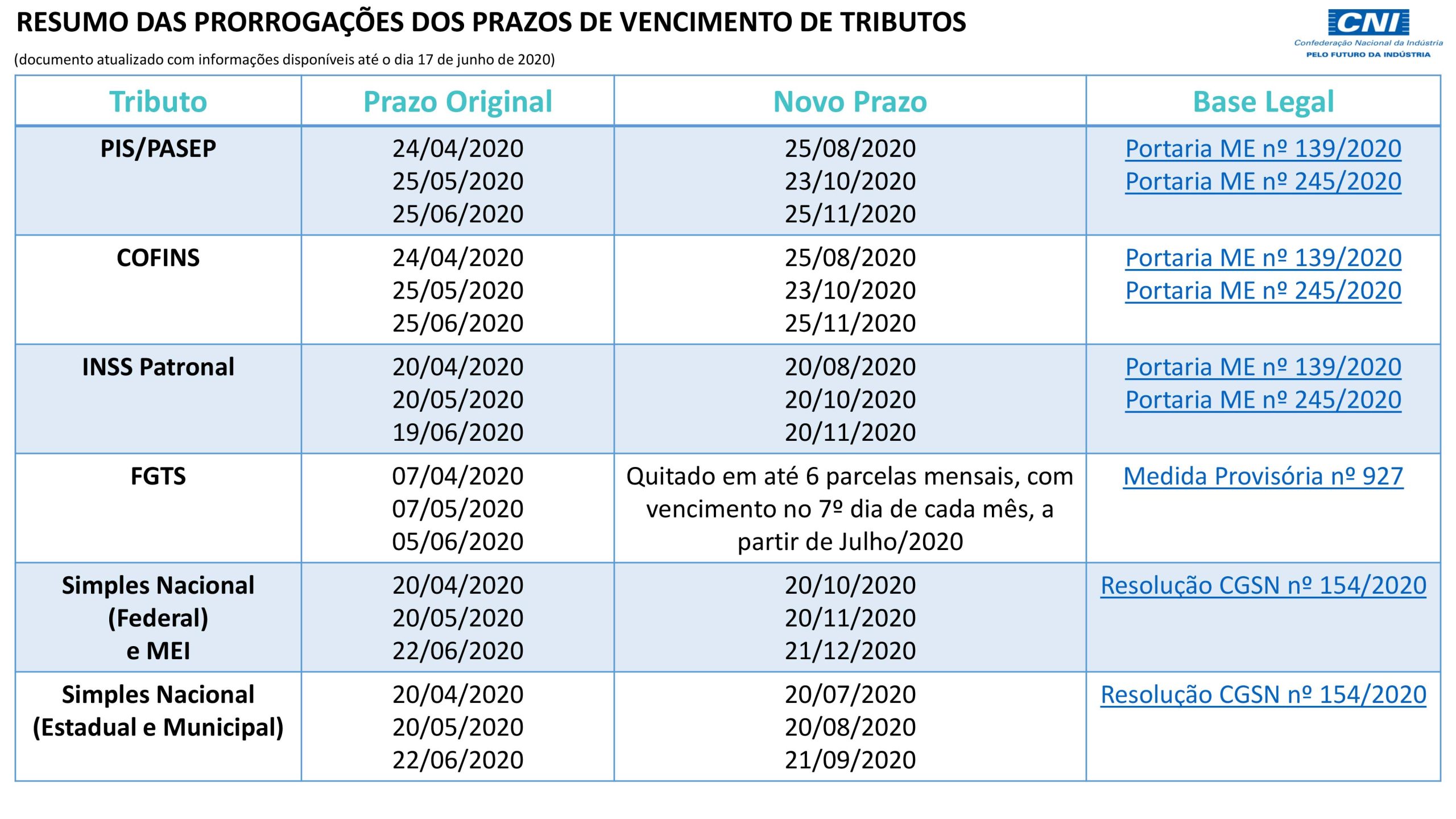 O SINDIMETAL/PR divulga tabela elaborada pela CNI com o resumo das prorrogações de prazos e vencimentos de tributos e obrigações acessórias federais, atualizado até 17/06/2020 .