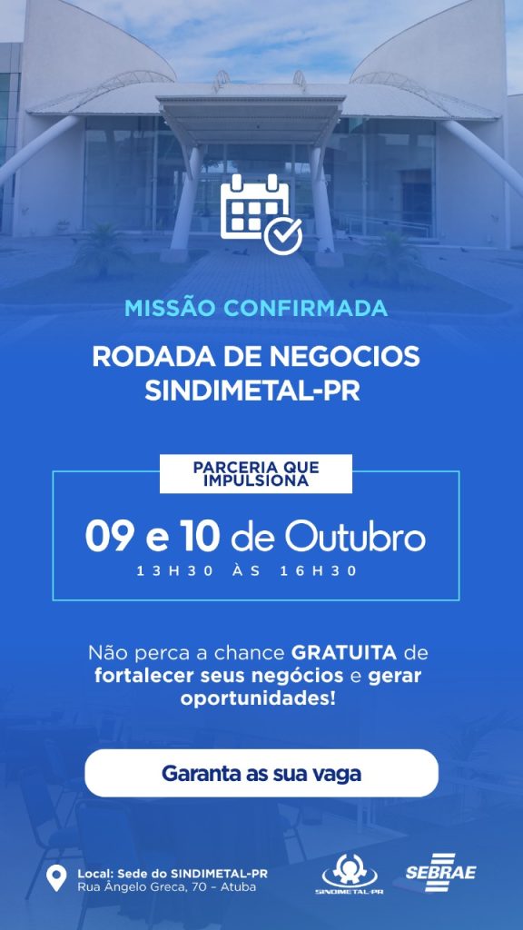 O encontro será nos dias 9 e 10 de outubro, na sede do Sindimetal-PR, em Curitiba. O objetivo é aproximar fornecedores de indústrias compradoras e âncoras, estimulando conexões estratégicas, parcerias comerciais e geração de novos negócios. As vagas são limitadas.