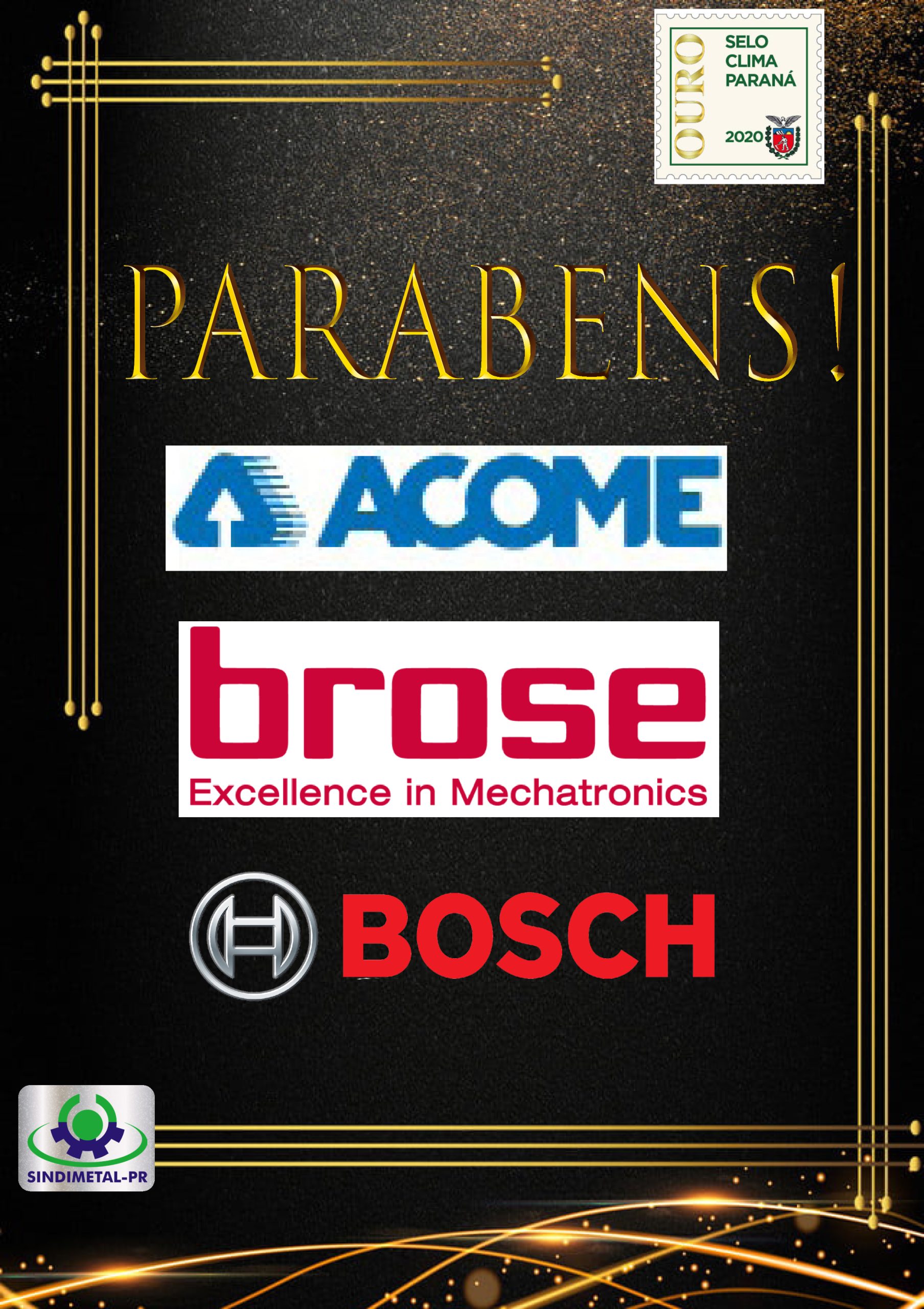 O SINDIMETAL/PR parabeniza as empresas ACOME DO BRASIL LTDA, BROSE DO BRASIL LTDA E ROBERT BOSCH LTDA pela obtenção do Selo Clima Paraná – “Original”.