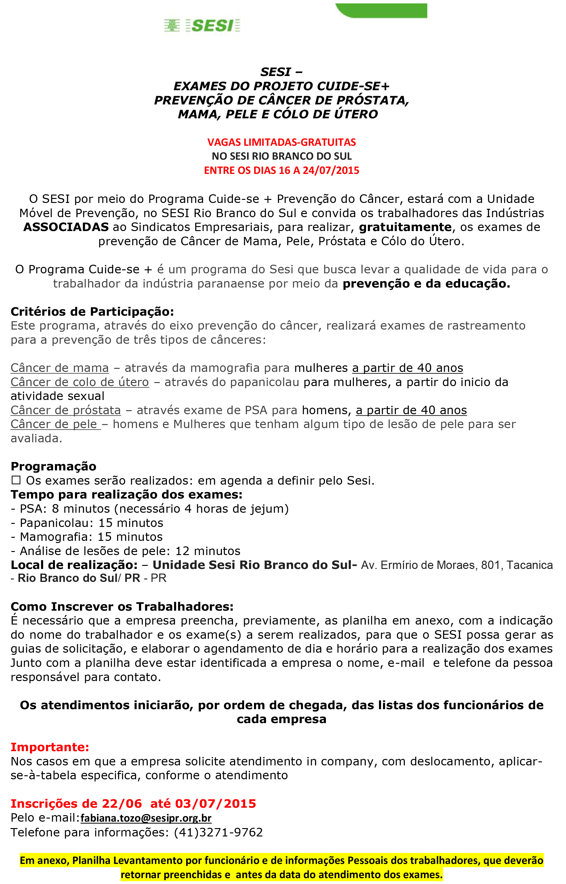 ABAIXO SEGUE Planilha Levantamento por funcionário e de informações Pessoais dos trabalhadores, que deverão retornar preenchidas e antes da data do atendimento dos exames.