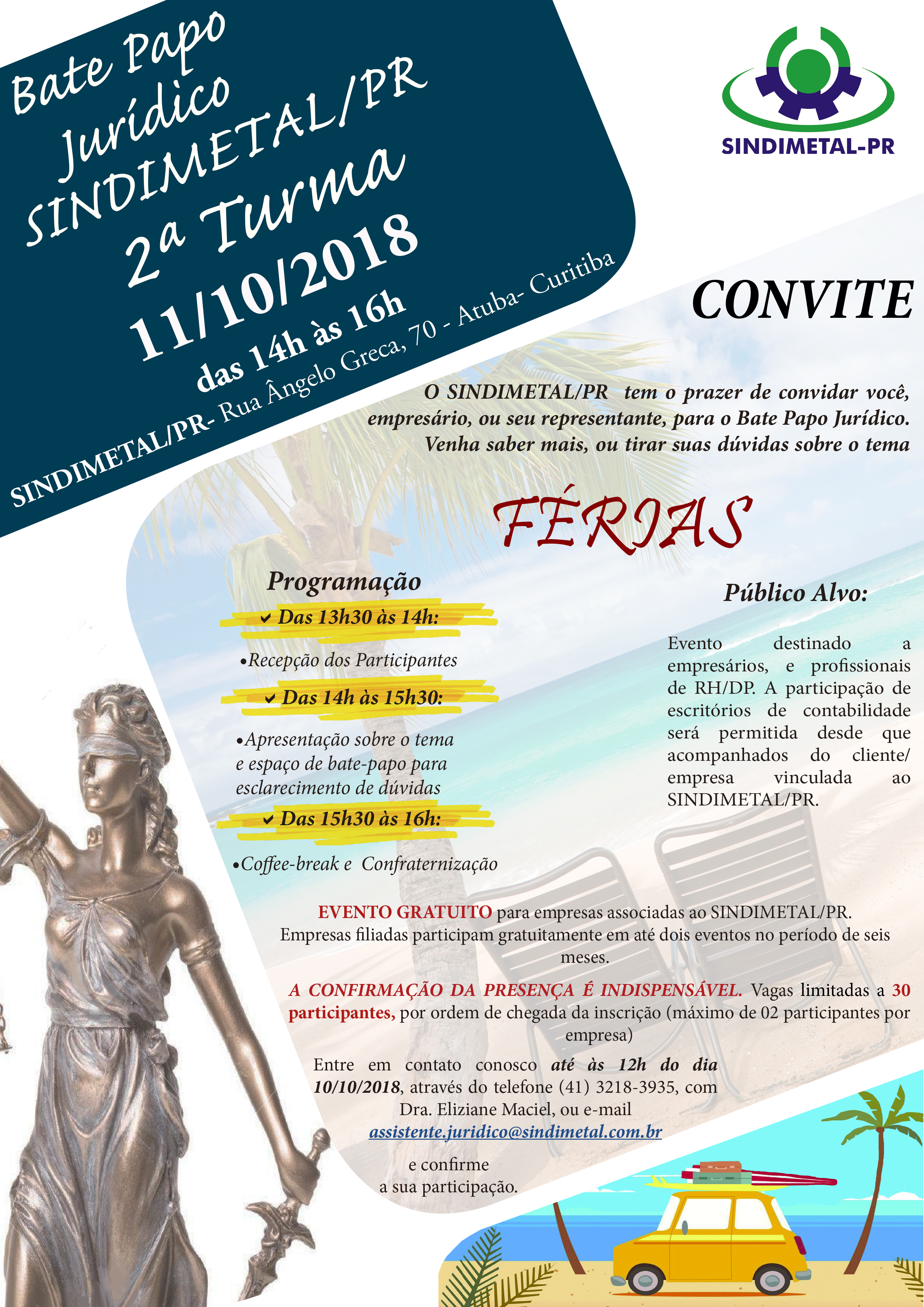 Portanto, não percam a oportunidade. Os profissionais que queiram participar do evento devem entrar em contato com a Dra. Eliziane Maciel até às 12h do dia 10/10/2018, pelo e-mail assistente.juridico@sindimetal.com.br, ou pelo telefone (41) 3218-3935, e confirmar sua presença. O evento é gratuito e as vagas são limitadas a 30 participantes, por ordem de chegada da inscrição (máximo de 02 participantes por empresa).