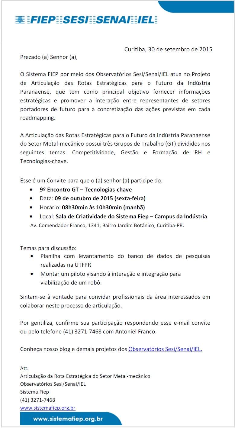 SINDIMETAL/PR CONVIDA – Grupo de Trabalho – Tecnologias-chave da Articulação da Rota Estratégica do Setor Metal-mecânico