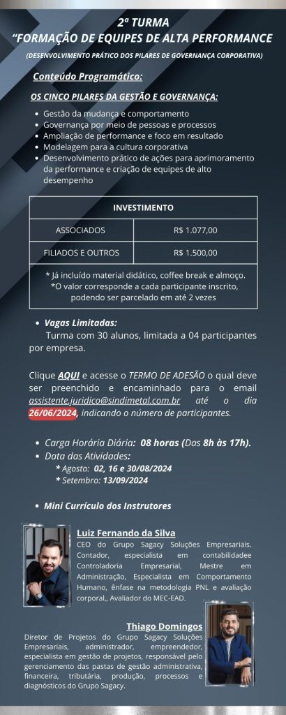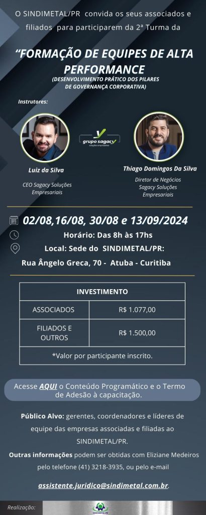 O SINDIMETAL/PR convida os seus associados e filiados para participar da segunda turma do curso “Formação de Equipes de Alta Performance – Desenvolvimento Prático dos Pilares de Governança Corporativa”.