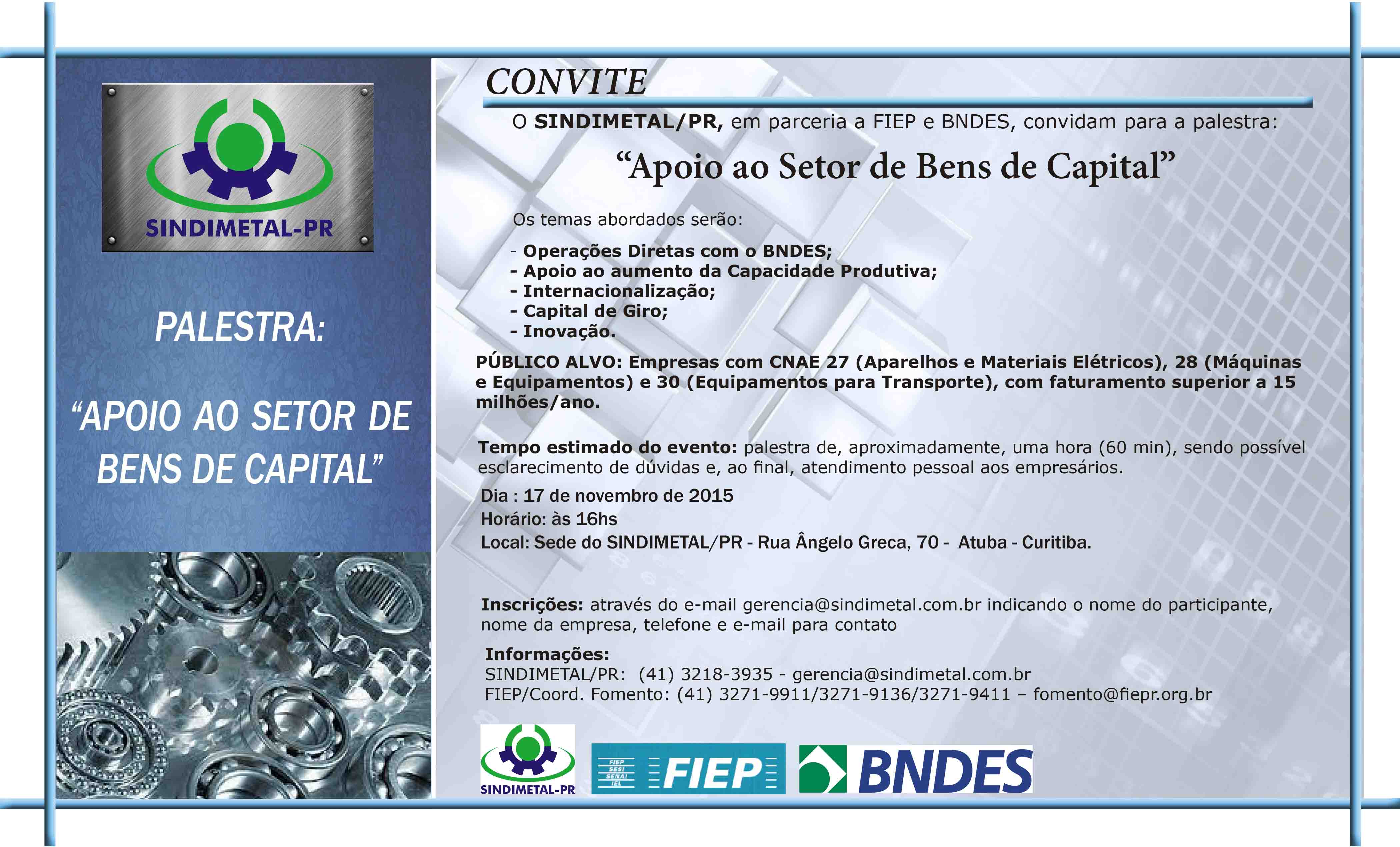 SINDIMETAL/PR convida para a palestra: “Apoio ao Setor de Bens de Capital”