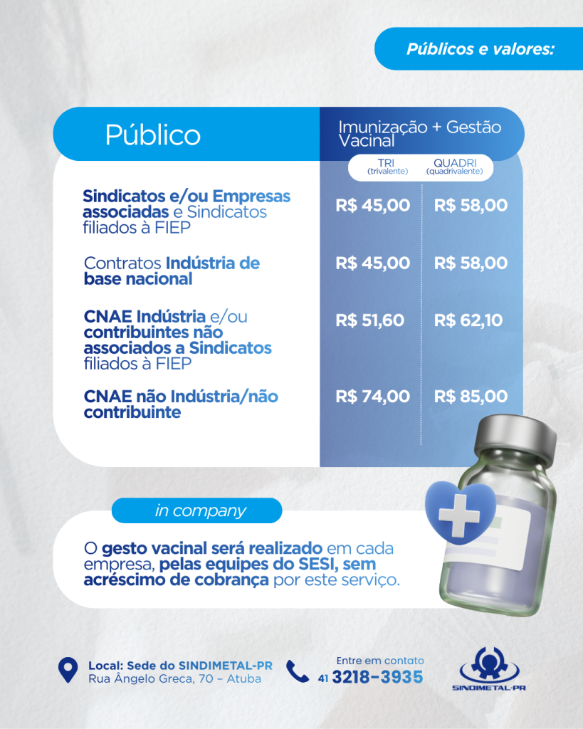 O SINDIMETAL/PR divulga a Campanha de Vacinação contra a Gripe 2026, realizada pelo Sesi/PR. Empresas associadas ao SINDIMETAL-PR e em dia com as contribuições têm acesso a descontos. Para garantir o benefício, é necessário apresentar a declaração de associação.