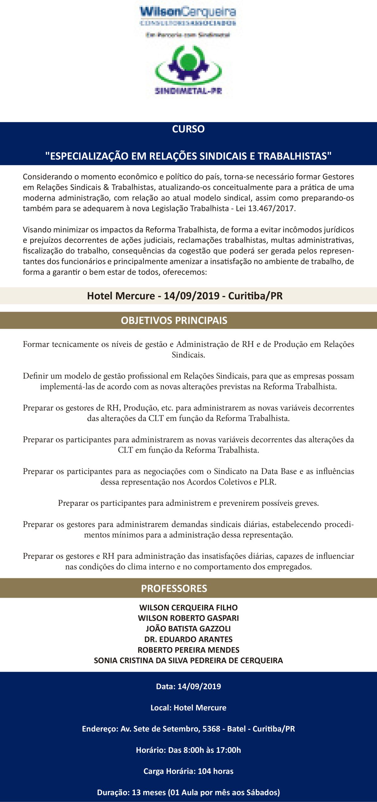 Com o objetivo de oferecer benefícios às empresas associadas o SINDIMETAL/PR firma parceria com a Wilson Cerqueira e Consultores Associados para realização do curso: