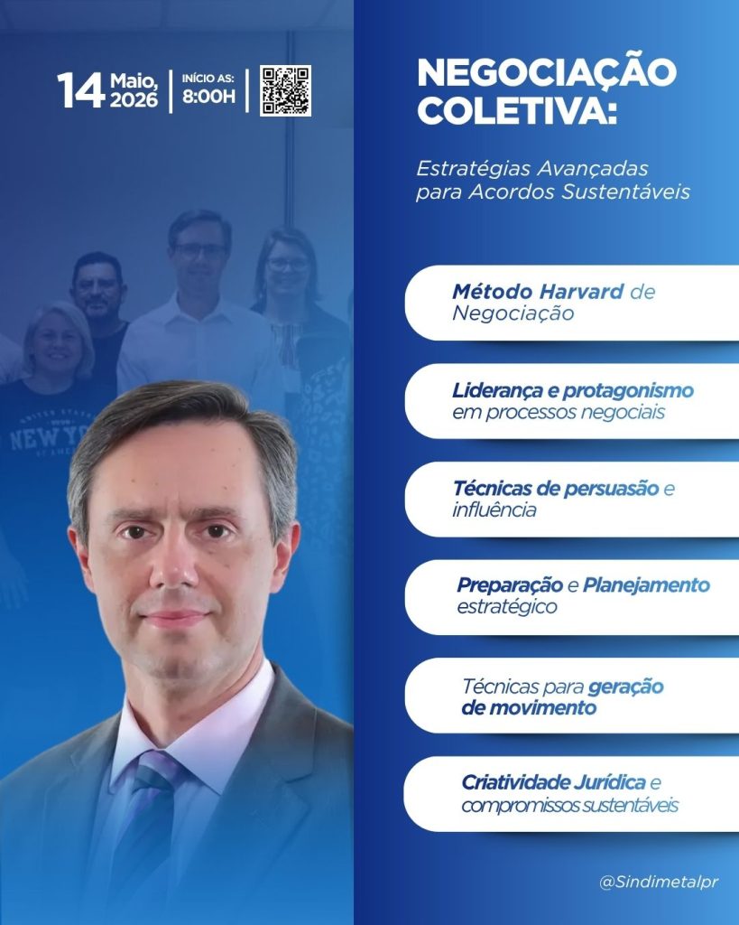 O SINDIMETAL-PR promove, no dia 14 de maio, o Curso Intensivo de Negociação Trabalhista. O treinamento será conduzido por Fernando Hoffmann, juiz titular da 22ª Vara do Trabalho de Curitiba e magistrado do TRT-PR.