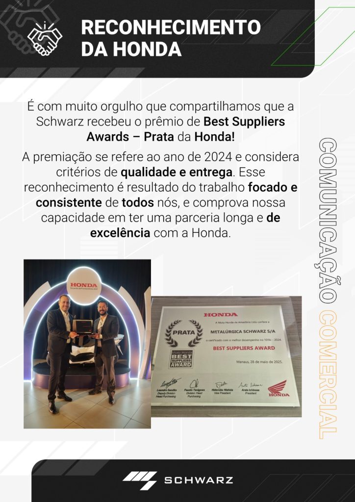 O Best Suppliers Awards é realizado anualmente pela Honda com o objetivo de reconhecer os fornecedores mais relevantes em diferentes áreas estratégicas. Estar na categoria Prata significa figurar entre os principais parceiros da montadora no ano, com desempenho acima da média nos critérios avaliados.