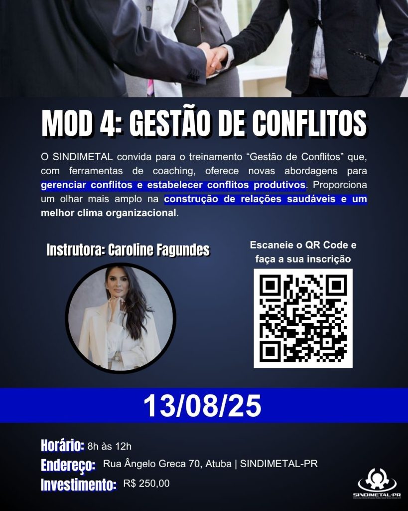 Então se inscreva já no treinamento do SINDIMETAL-PR “Gestão de Conflitos”.