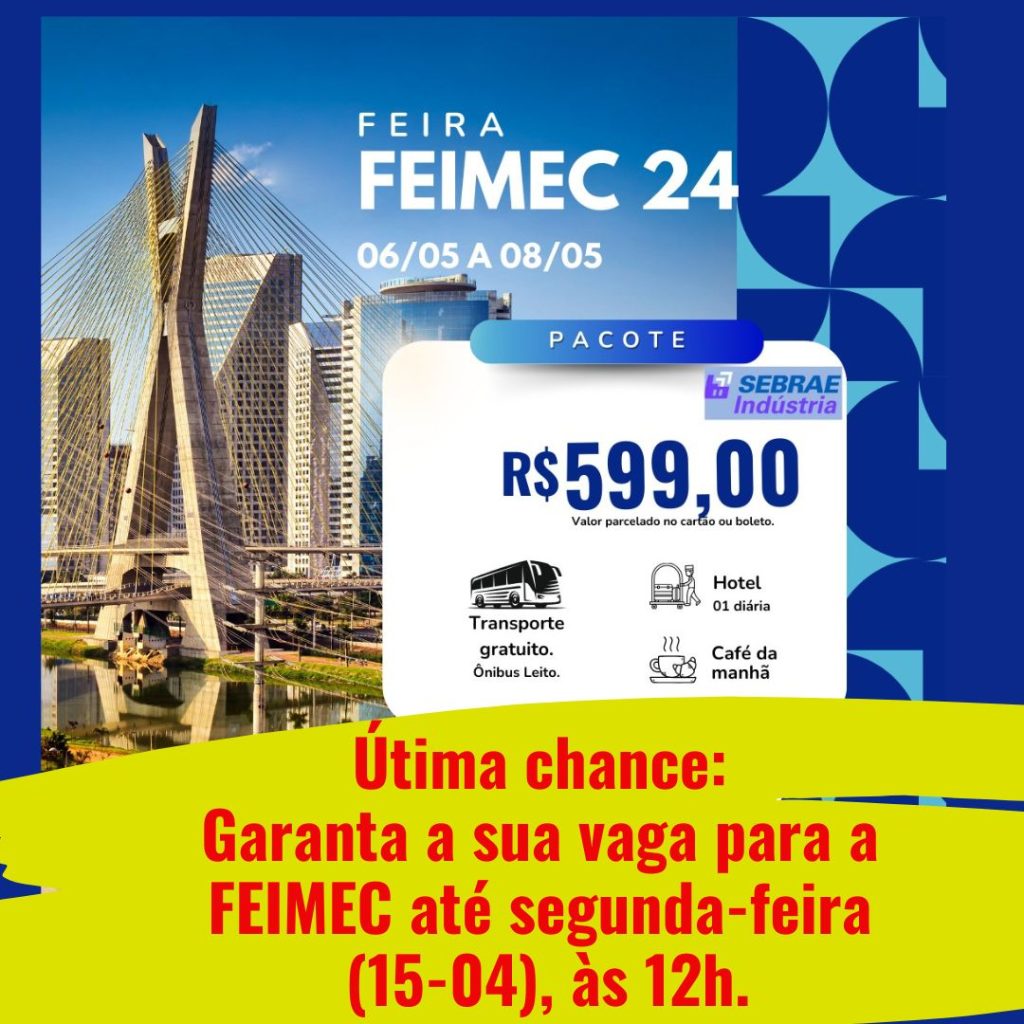 Os membros da Governança Metalmecânica que ainda não reservaram a sua vaga na Caravana do Sebrae para a FEIMEC- 24 têm até segunda-feira, às 12h, para garantir sua presença na maior Feira Internacional de Máquinas e Equipamentos do setor na América Latina.