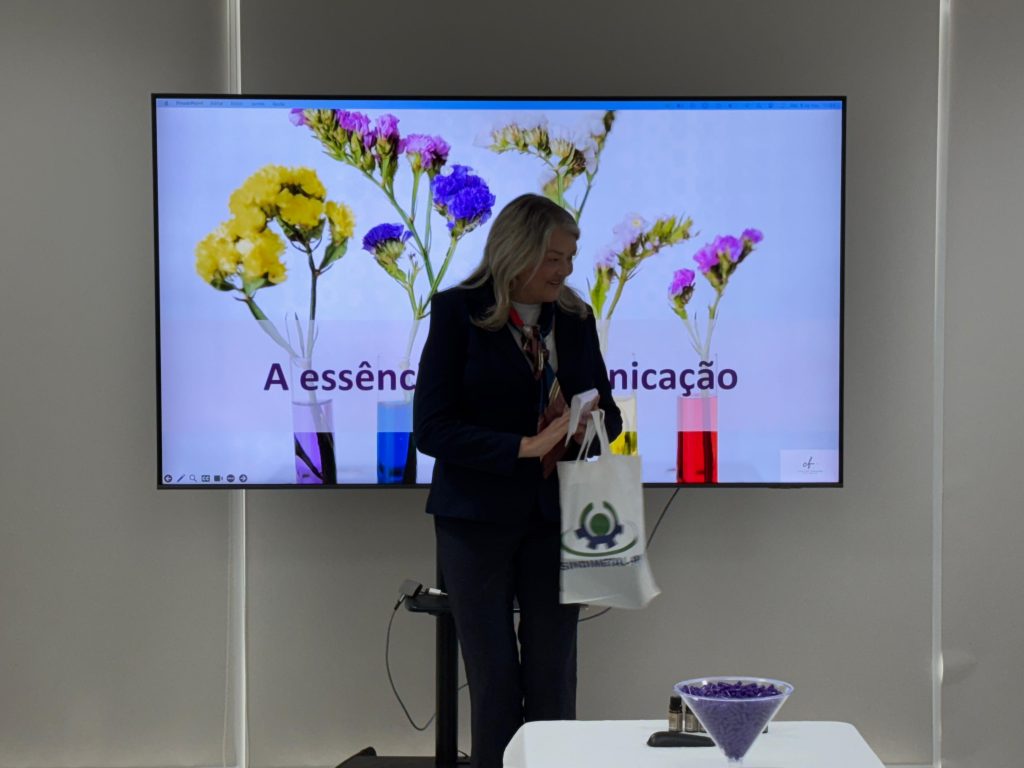 O diferencial do Workshop foi a junção do tema com conceitos da aromaterapia. Os participantes saíram da atividade com suas “próprias essências”, que foram formadas com base na autoavaliação sobre estilo de comunicação de cada um.